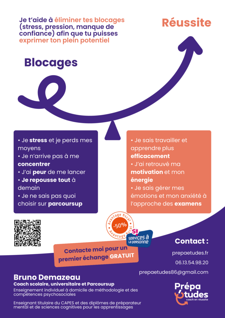 Enseignement particulier à domicile, dispensé par un professeur titulaire du CAPES et deux diplômes universitaires de sciences cognitives des apprentissages et de préparateur mental